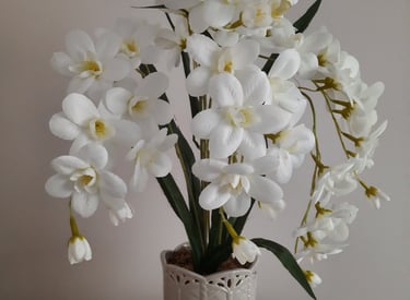Dirbtinių augalų kompozicija keramikiniame vazonėlyje