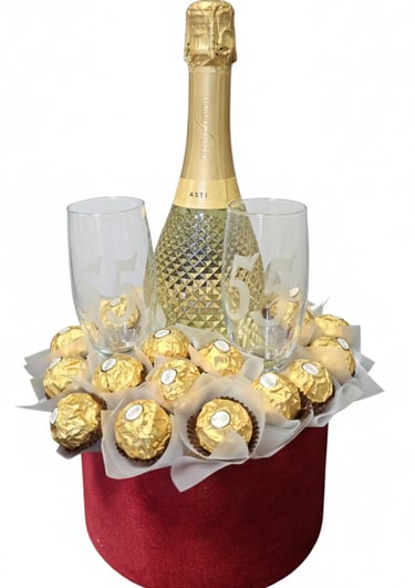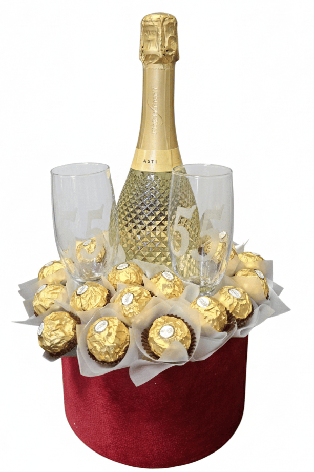 Saldainių puokštė su šampanu ir graviruotos stiklinėm